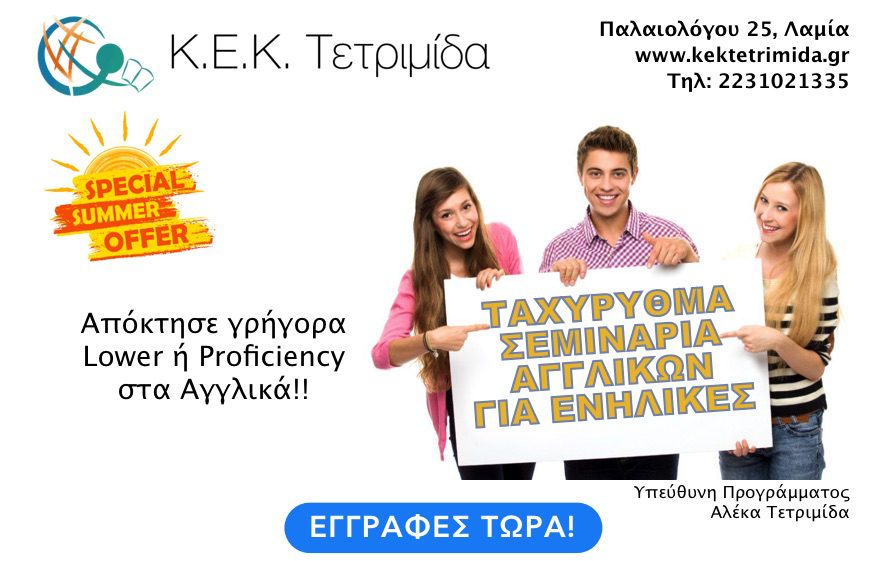 Για να κάνετε αίτηση για τα σεμινάρια Αγγλικών, απευθυνθείτε στα τηλέφωνα 2231021335 ή επισκεφτείτε τα γραφεία του «ΚΕΚ ΤΕΤΡΙΜΙΔΑ», Παλαιολόγου 25 στη Λαμία.